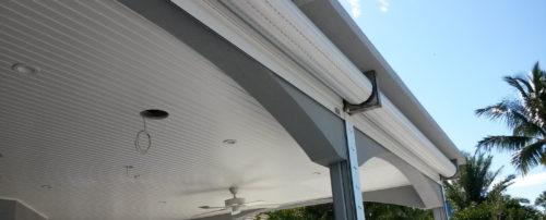 Todays Bahamas shutters are manufactured from heavy extruded aluminum. They are permanently mounted above each opening on a 45-degree angle. The design of this modern Bahamas hurricane shutter allows the homeowner to see through between the aluminum horizontal slats.